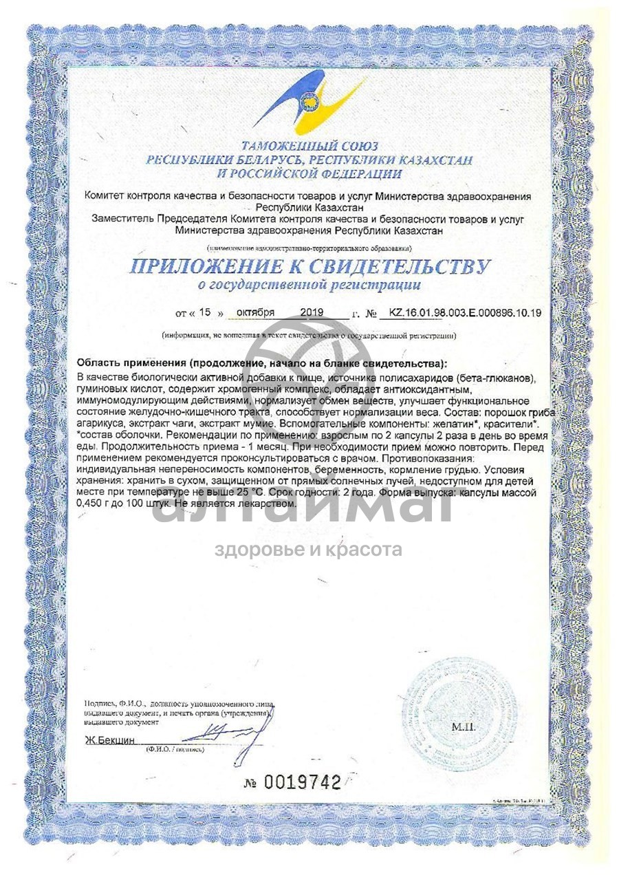 Обладает антиоксидантным, иммуномодулирующим действиями. Нормализует обмен веществ. Улучшает функциональное состояние желудочно-кишечного тракта. Способствует нормализации веса. Источник полисахаридов (бета-глюканов), гуминовых кислот, содержит хромогенный комплекс. 30 капсул по 450 мг.Состав: порошок гриба акарикуса, экстракт чаги, экстракт мумие. Вспомогательные компоненты: оболочка капсулы (желатин, диоксид титана - краситель).