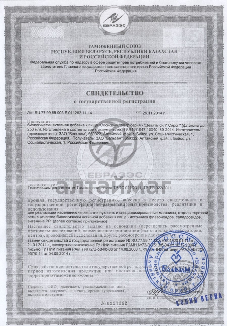 Сироп «Девять сил» входит в серию натуральных сиропов Сосновый мёд. Их основа - сосновые почки и лекарственные травы Горного Алтая.