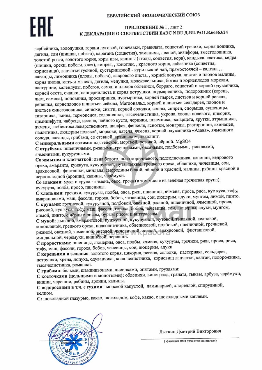 Не содержит: красители, ароматизаторы, ГМО, консерванты, сахар, соль, молоко, яйца, глютен.