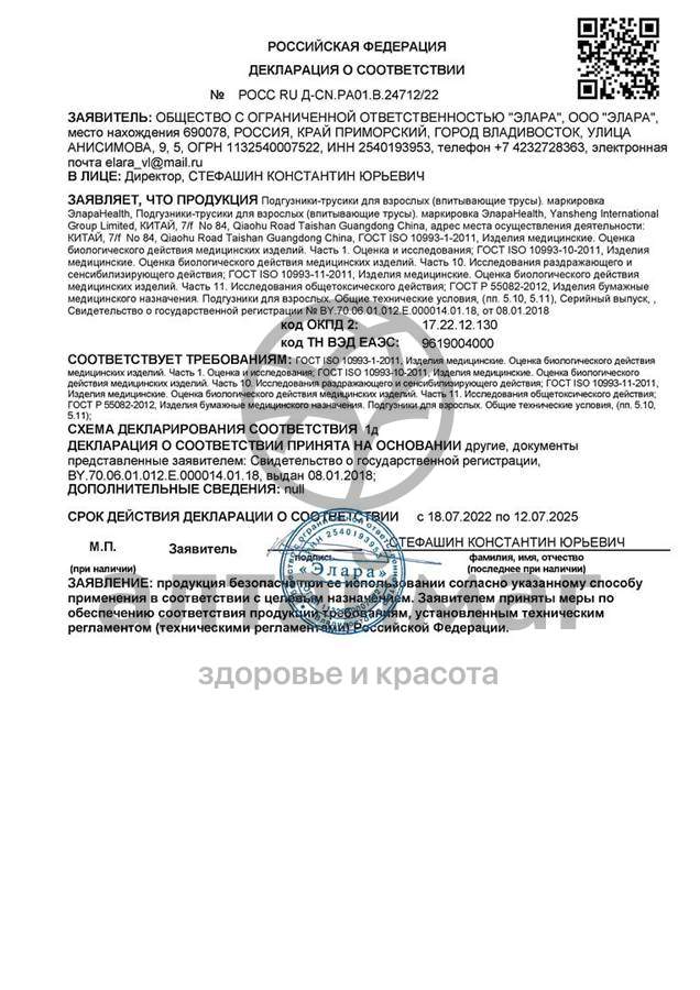Впитывающие трусы для взрослых ЭлараHealth. Подгузники трусики для взрослых отличаются тем, что их можно надевать и снимать как обычное бельё. Поэтому они лучше подходят для людей, ведущих активный образ жизни. Подгузники-трусики более тонкие чем обычные подгузники для взрослых, за счёт чего не заметны под одеждой.