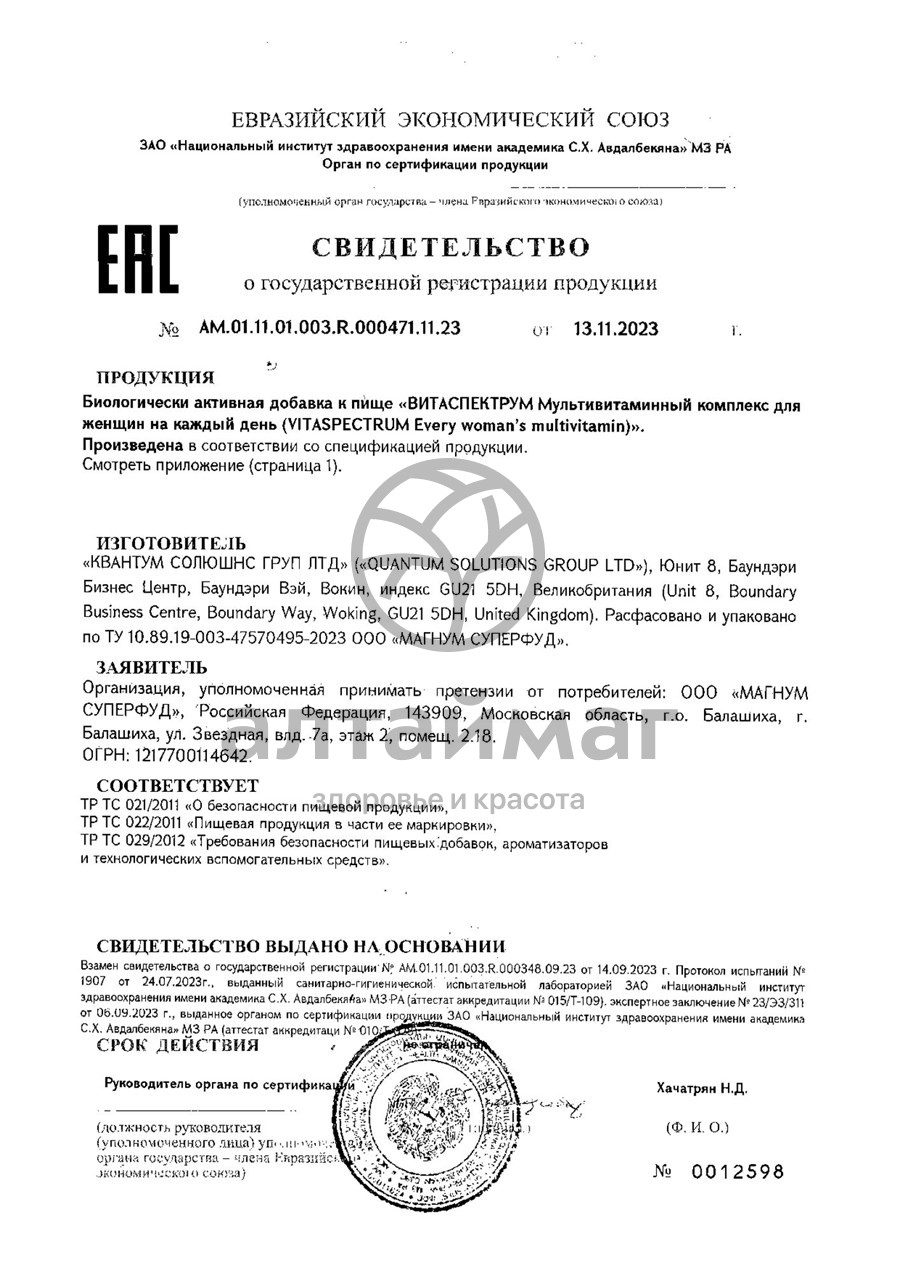 - Купите Витамины для женщин VitaSpectrum 60 таблеток в Астрахани по доступной цене 785 ₽ с доставкой на дом или заберите Ваш заказ в Астрахани из ближайшего пункта выдачи, сделав заказ на AltaiMag.ru.