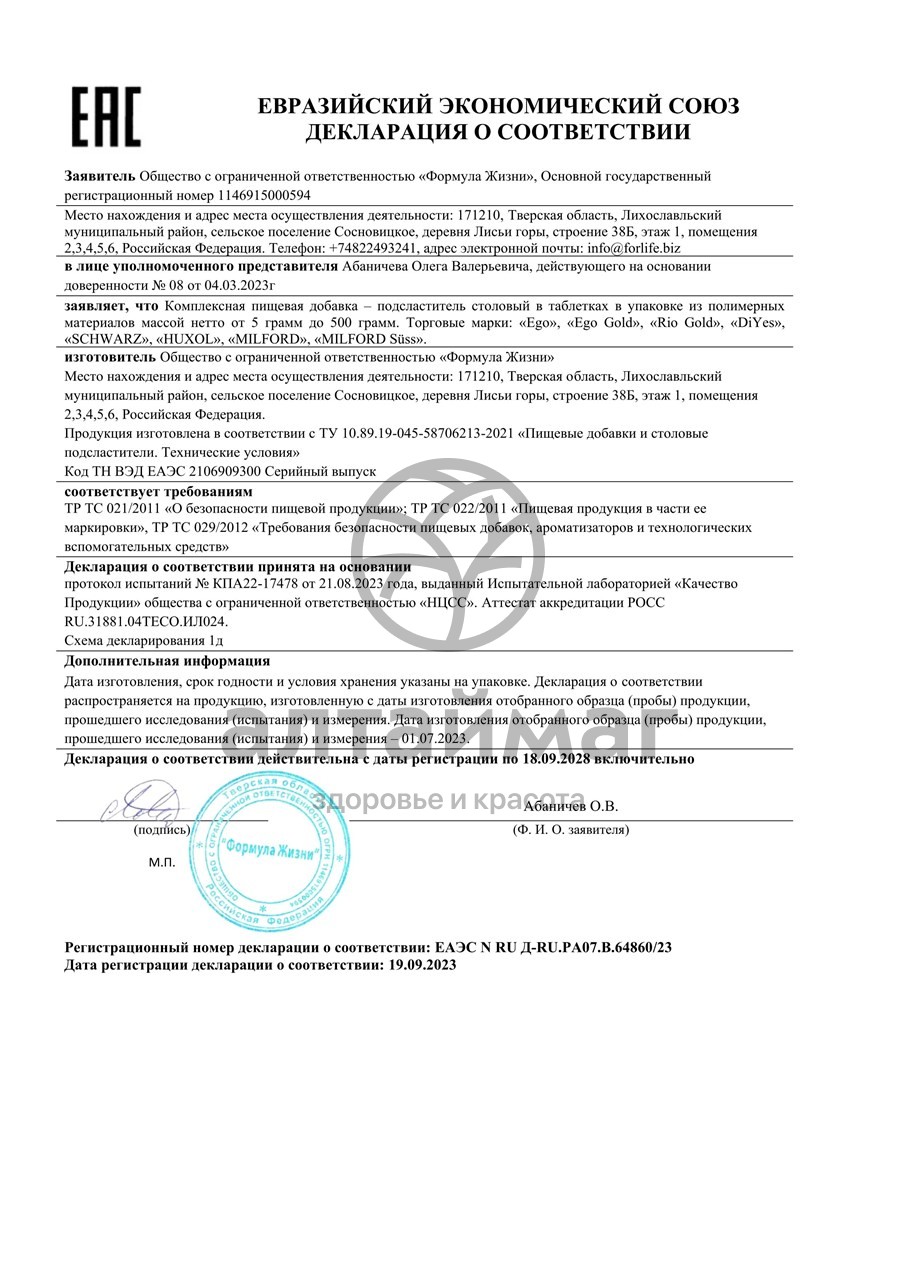 1 таблетка соотоветствует 1 чайной ложке сахара, при этом количество потребляемых калорий равно 0.Характеристики: